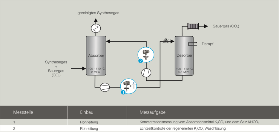 LiquiSonic®gewährleistet eine präzise Konzentrationsmessung in einer 3-Komponenten-Flüssigkeit mit permanenter Datenaufzeichnung. So wird eine automatische Regelung der K2CO3 - Lösung im Bereich der maximalen Absorption bzw. des maximalen Wirkungsgrades des Gaswäschers ermöglicht.