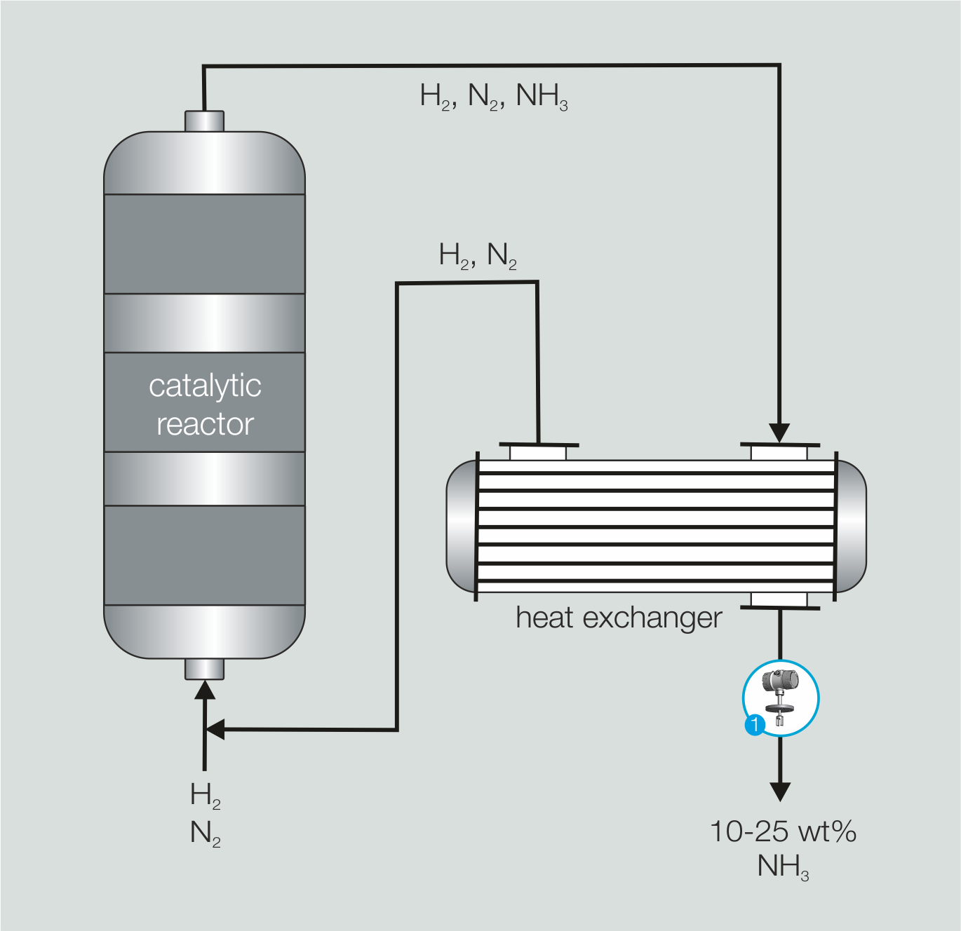 Ammonia (NH₃) is the basis of almost all nitrogen-containing fertilizers. After the catalytic conversion of nitrogen and hydrogen in the Haber-Bosch process, the reaction mixture is cooled so that ammonia passes into the aqueous phase. Typical NH₃ concentrations are around 10–25 wt%.