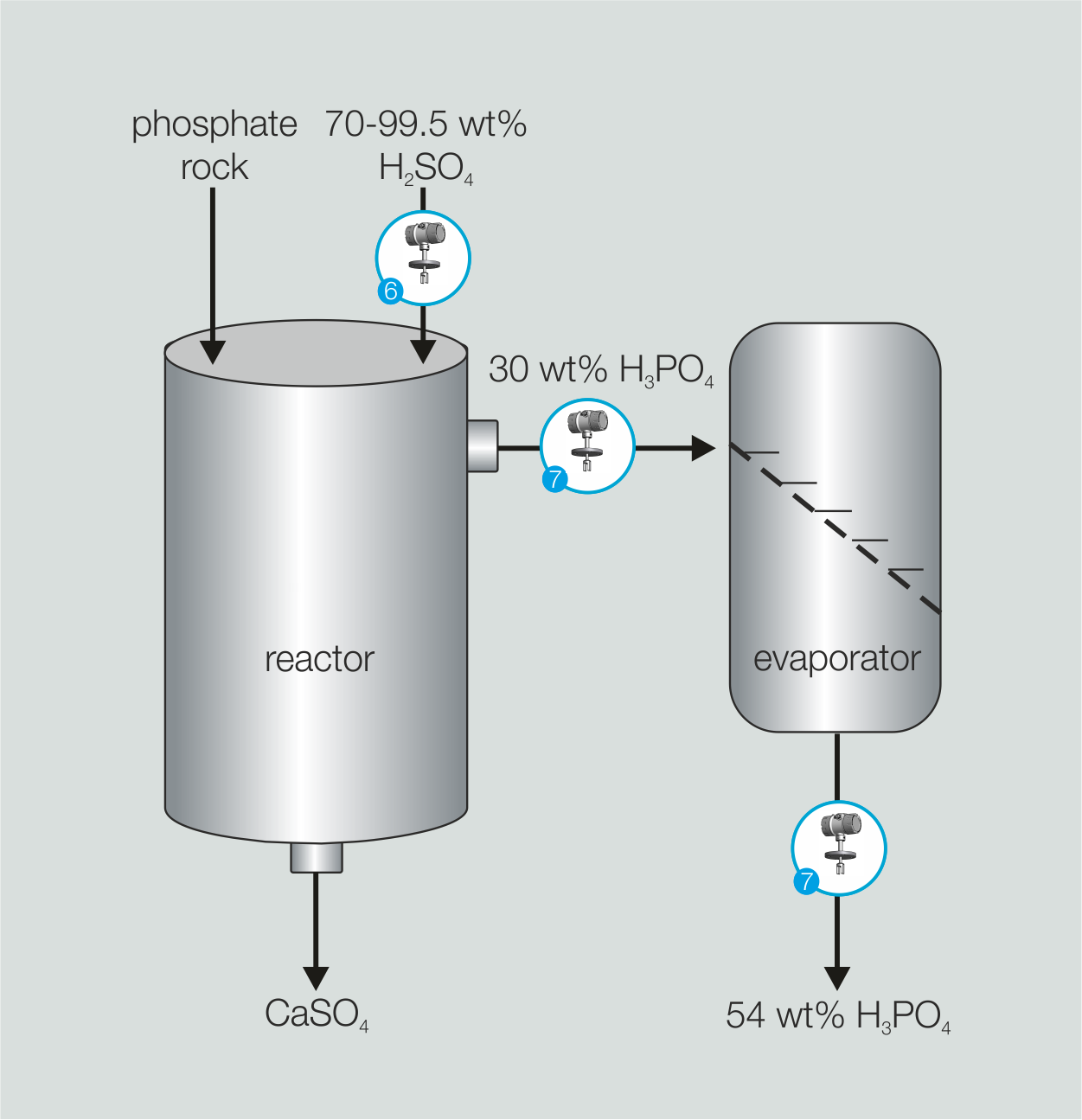 Phosphoric acid is mainly produced using a wet process by reacting phosphate-containing rock with concentrated sulfuric acid. The resulting crude phosphoric acid contains around 30 wt% H₃PO₄ and is then concentrated to up to 54 wt%. Turbidity, solids and variable composition place high demands on the measurement technology.