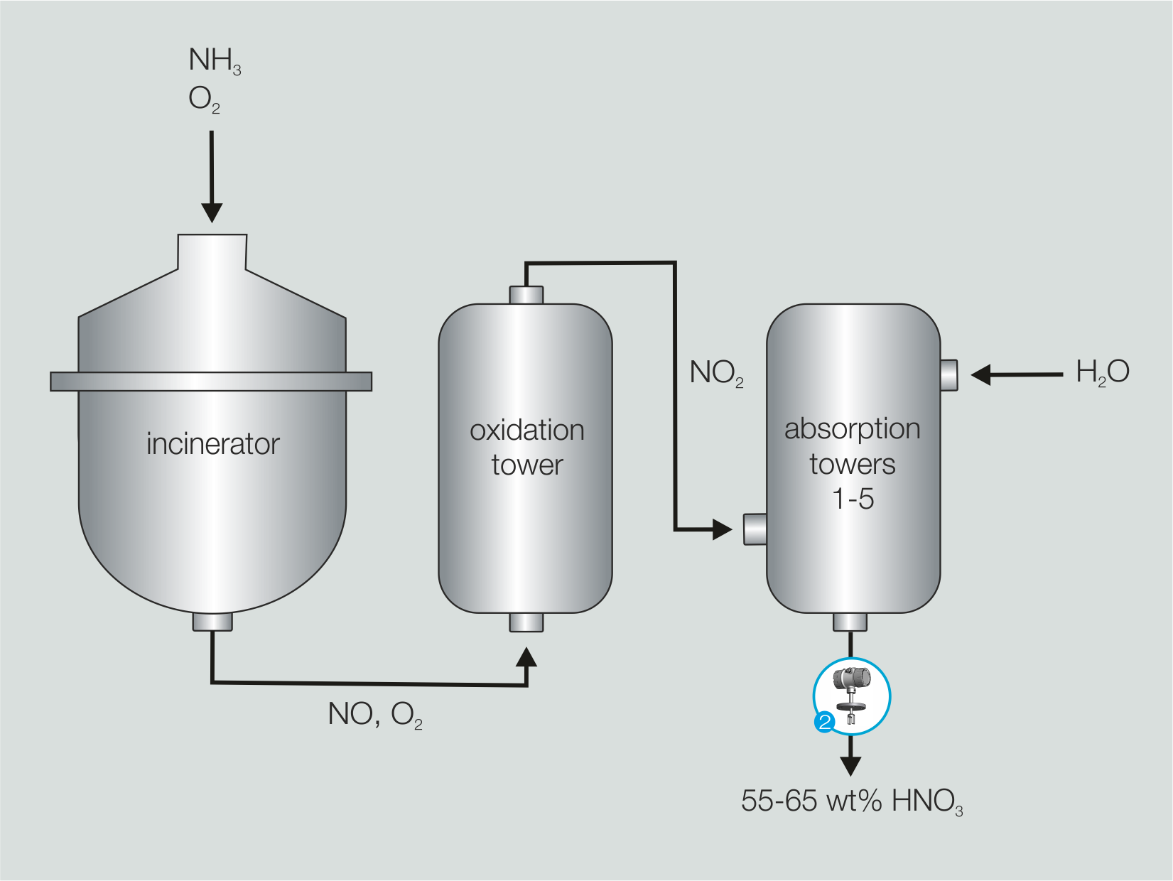 LiquiSonic® monitors this concentration range continuously and precisely. Inline measurement enables reliable control of the absorption process, reduces concentration fluctuations and increases both process reliability and the efficiency of nitric acid production.