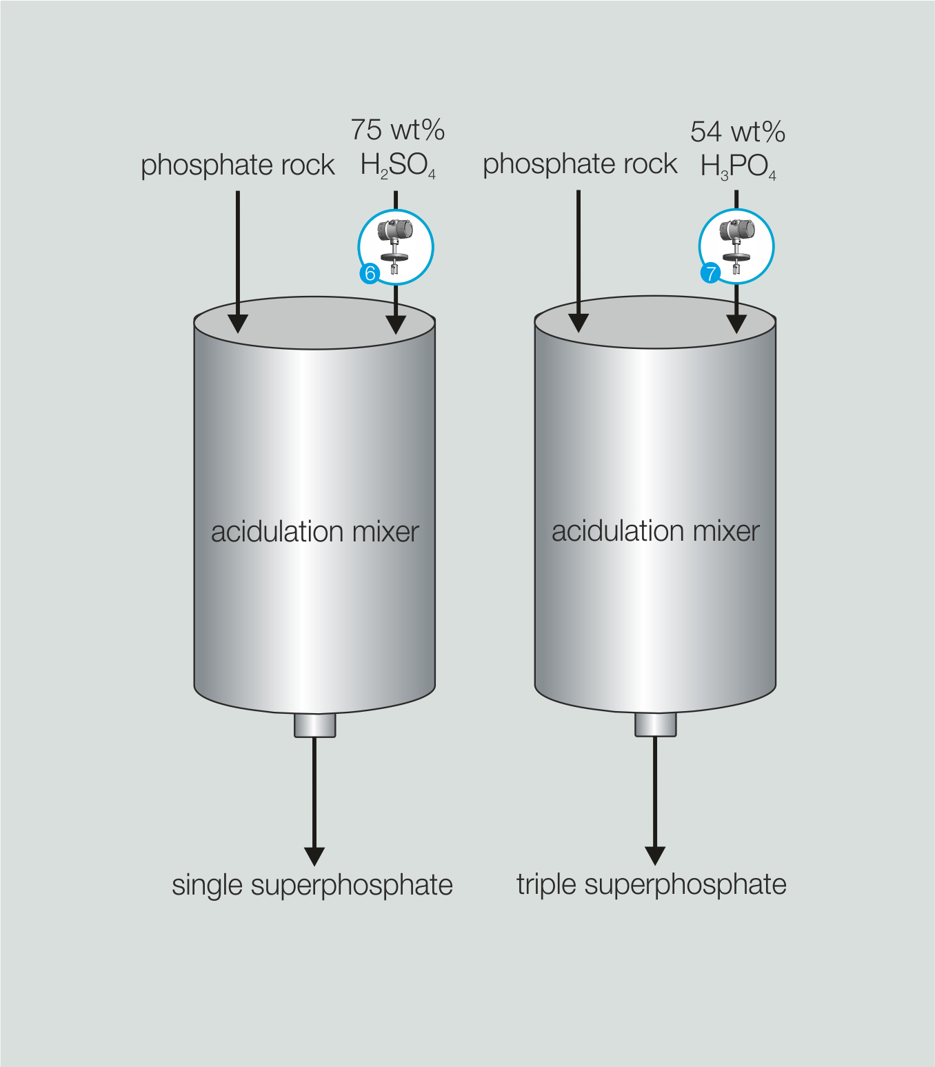 When producing single and triple superphosphate, rock phosphates react with either sulfuric acid (SSP) or phosphoric acid (TSP). The exact adjustment of the acid concentrations is crucial for the course of the reaction, product quality and use of resources.